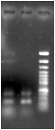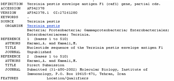 Samples taken from members of one family in the same village, reveled several Gram negative coocobacill shape bacteria similar to Francisella tularensis and Yersinia pestis. Further bacteriological analysis In Institute Pasteur in Teheran demonstrated that bacteria are more similar to Yersinia pestis with Negative in Nitrate reduction and positive in Arabinose. Diagnosis of plague was suspected and confirmed by isolation of a bacterial DNA and molecular analysis. Figure 1 demonstrates the PCR product of 530 bp from F1 gene of the Yersinia pestis. Figure 2 is result of Nested PCR with inner primers to f1 gene and as its shown 2 fragment of 530 bp original gene and 280 bp is shown. The sequencing and PCR data demonstrate that Bacteria had F1 gene sequence (Figure 3-5).