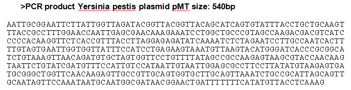 PCR was performed on DNA extracted from isolated bacteria from blood cultures. We have uses primers specific for F1 gene of the yersinia pestis as bellow protocols: