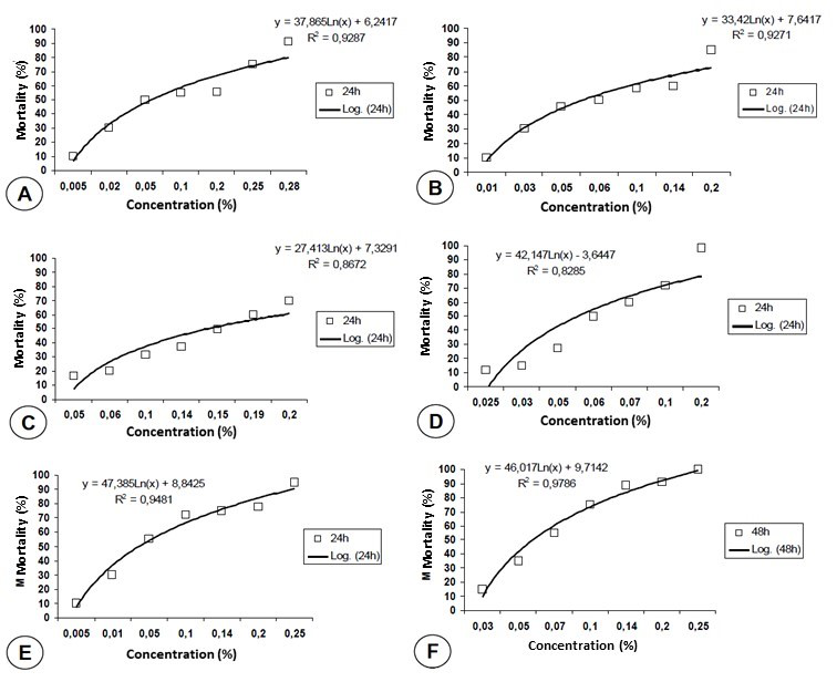 Figure 1 Mortality of Rhipicephalus sanguineus larvae by the action of different concentrations of the following acaricides: (A) Deltamethrin, (B) Cypermethrin, (C) Permethrin, (D) Cypermethrin + Piperonyl Butoxide, (E) Amitraz (24h), and (F) Amitraz (48h), in Goiânia, Goiás State, Brazil. The squares represent the mean mortality percentages obtained with the different concentrations and the trend line is derived from log-probit analysis. R2 = coefficient of determination; y = straight line equation.