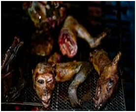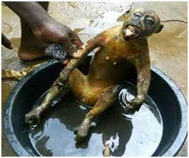 Bush meat hunting and consumption is a common practice in rural communities and urban centers because of its delicacy and for-profit purposes.1,2 It is a term for meat from wild animals that are slaughtered and prepared for personal consumption or sold traditionally in Nigeria and other parts of the world. It is a source of income for many and to a larger extent, for food. Although the name ‘bushmeat’ is synonymous with animals such as apes and monkeys, it also comprises rodents, reptiles, birds, elephants among others. Feeding on meat from these animals may constitute a public health risk because the hunted animals may be carriers of bacterial and viral pathogens who are causative agents of diseases of public health importance. Such diseases include Ebola, Rift Valley fever, rabies, anthrax, monkeypox etc.3 In the DRC in 1997, animals caught from the wild were tested for the monkeypox virus. Hutin et al.,4 in establishing the cause of monkeypox disease, the following animals were found to have neutralizing antibodies against the monkeypox virus, suggesting a role as natural reservoirs: domestic pig (Sus scrofa), Gambian rat (Cricetomys emini), elephant shrew (Petrodromus tetradactylus), Thomas's tree/rope squirrel (Funisciurus anerythrus), Kuhl's tree squirrel (Funisciurus congicus), and sun squirrel (Heliosciurus rufobrachium). An example of the animals in the wild commonly hunted for consumption in Nigeria is the monkey, which is shown in (Figure 1) (Figure 2).