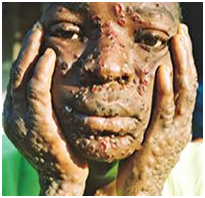 Monkeypox, a member of the genus Orthopoxvirus and the family Poxvirida is an uncommon zoonotic disease that is prevalent in forested areas of Central and West Africa with a fatal illness. The virus was first identified in Denmark in 1958 and has human monkeypox (formerly known as Zaire) in 1970 in the Democratic Republic of Congo. In Nigeria, the first outbreak occurred in 1971, the second outbreak in 1978 and a re-emergence on 20 September 2017 in Bayelsa State. A total of 172 suspected and 61 laboratory-confirmed cases were reported in 14 States of the Federation.5 Monkeypox can cause a syndrome clinically similar to smallpox but overall is less infectious and less deadly. The incubation period averages 12 days, ranging from 4-20 days. The most reliable clinical sign differentiating monkeypox from smallpox and chickenpox is enlarged lymph nodes, especially the sub-mental, submandibular, cervical, and inguinal nodes.6 Figure 3A-3C shows patients suffering from monkeypox in Nigeria. For laboratory analysis of the monkeypox, a viral culture should be obtained from an oropharyngeal or nasopharyngeal swab. A skin biopsy specimen of the vesiculo pustular rash or a sample of the roof of an intact vesiculo pustule should be analyzed. Tissue for PCR of DNA sequence-specific for the monkeypox virus may be obtained. Paired sera for acute and convalescent titers may be analyzed. Serum collected more than 5 days for IgM detection or serum collected more than 8 days after rash onset for IgG detection is adjudged most efficient for the detection of the monkeypox virus infection.6