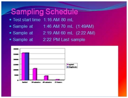 After 30 minutes of allotropic oxygen treatment, a 10mL aliquot was taken while stirred. After another 30 minutes of treatment another 10mL sample was taken. After an additional 11 hours of Allotropic oxygen treatment the last 10mL sample was taken. Two blanks were taken from the dilution water not treated. 1 Aliquot of water was aranized for comparison.