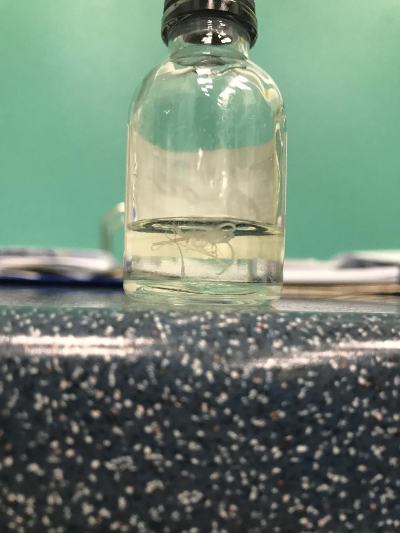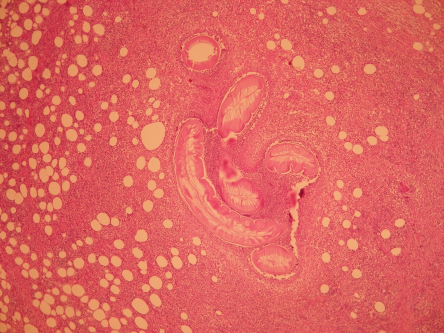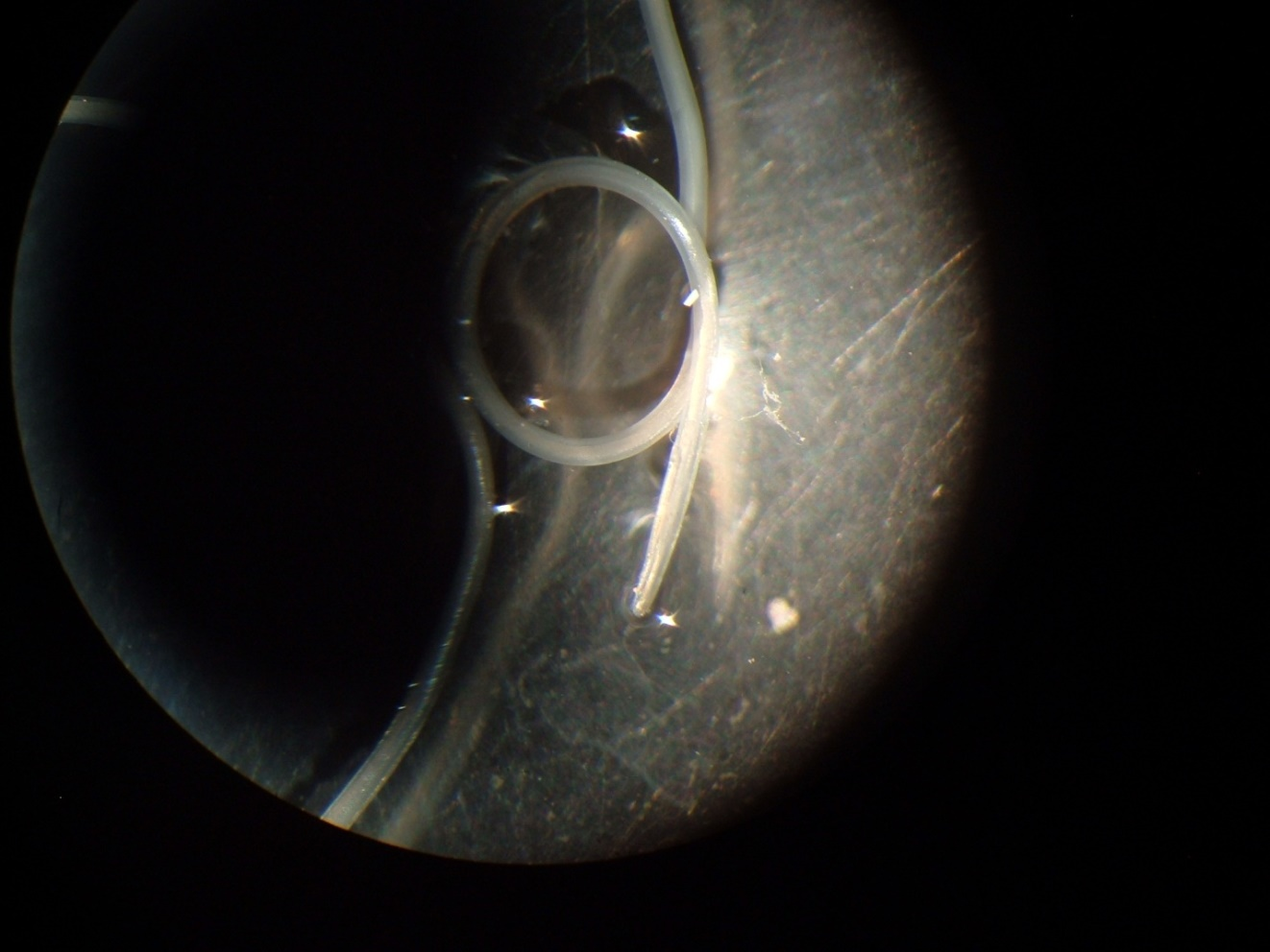At admission, the complete blood cell count was normal, without eosinophilia. The nodule was surgically removed under local anesthesia, with a surprinsing inside outcome: a living and coiled roundworm emerged intact from lesion. The worm was sent to Colentina Hospital-Parasitic Diseases Department for identification and the patient for medical assessment. Nematod was introduced in a 70% ethylen alcool solution with 5% glycerin, being macro and microscopically examined (Figure 2).