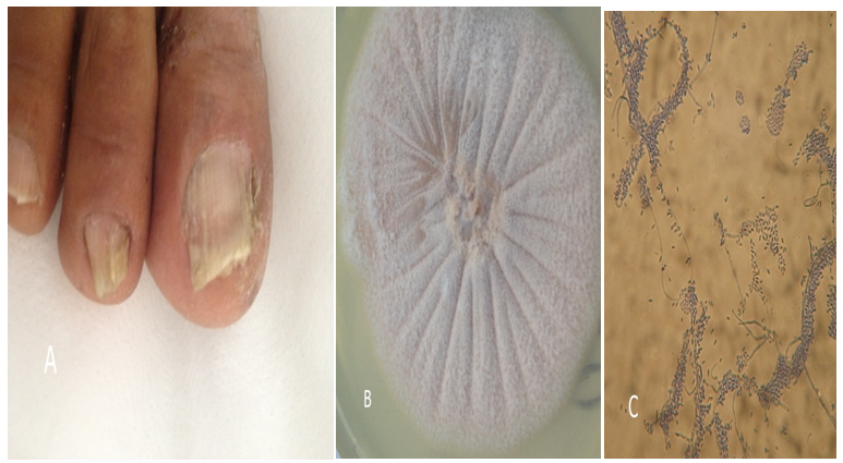 Methods: The specimens were tested by direct microscopic examination using potassium hydroxide (20%) and culturing on Sabouraud’s dextrose agar and fungobiotic agar containing cyclohexamide and chloramphenicol.