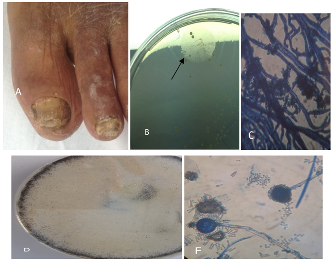 (A) distal subungual onychomycosis and total dystrophic onychomycosis. (B) Rhizopus spp. colony. (C) Microscopic, Rhizopus. First grows rootlike structures at the base of the fungal strands (hyphae). (D) Rhizopus spp. colony. (F) Microscopic, sporangiophores, and sporongiospores.