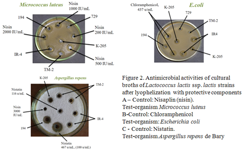 Figure 2 Antimicrobial activities of cultural broths of Lactococcus lactis ssp. lactis strains after lyophilization with protective components.