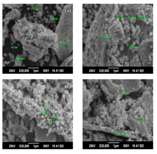 The size and structure of silver nanoparticles synthesized with Punica granatum aqueous leaf extract was further subjected to SEM analysis to examine the morphology of the nanoparticles. The Punica granatum leaf extract mediated synthesized silver nanoparticles were spherical, rhomboid and cubical in shape and had diameter of nanoparticles ranged from 88.0–120nm and average size of particles were 98.93nm. Kumar, et al.,19 reported the size of alion mediated synthesized nanoparticles to be in range osf 287-293nm and average size was 70nm. Firdhouse, et al.,30 reported the size of silver nanoparticles synthesized by ethanolic leaf extract, ranging from 20–150nm in diameter (Figure 3).