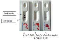 A total of 40 isolates were obtained from the cultured sputa samples. The isolates were subjected to SD Bioline® TB AgMPT64 analysis, according to the manufacturer’s instructions. This test consisted of test cassette which consists of a sample pad, a gold conjugate, a nitrocellulose membrane, and an absorbent pad. Mouse monoclonal anti-MPT64 was immobilized on the nitro cellular membrane as the capture material (test line). Another antibodies, which recognized another epitope of MPT64, conjugated with colloidal gold particles were used for antigen capture and detection in a sandwich type assay. The cassette has a letter T and C as test line and control line on the surface of the case. Positive results produced red to purple band. In the absence of MPT64, there is no line in the test region. Briefly, 5-7 colonies were emulsified in about 200µml sterile buffered saline, then, 100µml of the suspension added into the sample well and allowed to stay for 15minutes before being red positive result is indicated by the presence of 2 color bands (one control band and one test band).The presence of only one control band within the result window indicated a negative result. Faint color band was recorded as a weak positive and the sample was retested.