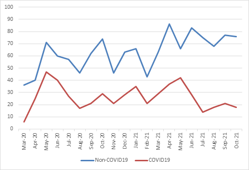 When comparing the prevalence of MDR pathogens from critically ill patients admitted to ICUs to patients with COVID-19, we observed that there was a temporal trend towards an increase in non-COVID-19 sectors and this fact may be related to the shorter of length of hospital stay of the COVID-19 patients (due to the severity and often fatal outcome), which could interfere with periods of colonization necessary before infections. Another possible cause of the progressive increase in bacterial resistance in non-COVID-19 sectors may be related to cross transfer from health-care professionals or due to difficulties in hospital cleaning processes that we had during the pandemic in almost all units due to lack of human resources and shortages of personal protective equipment.