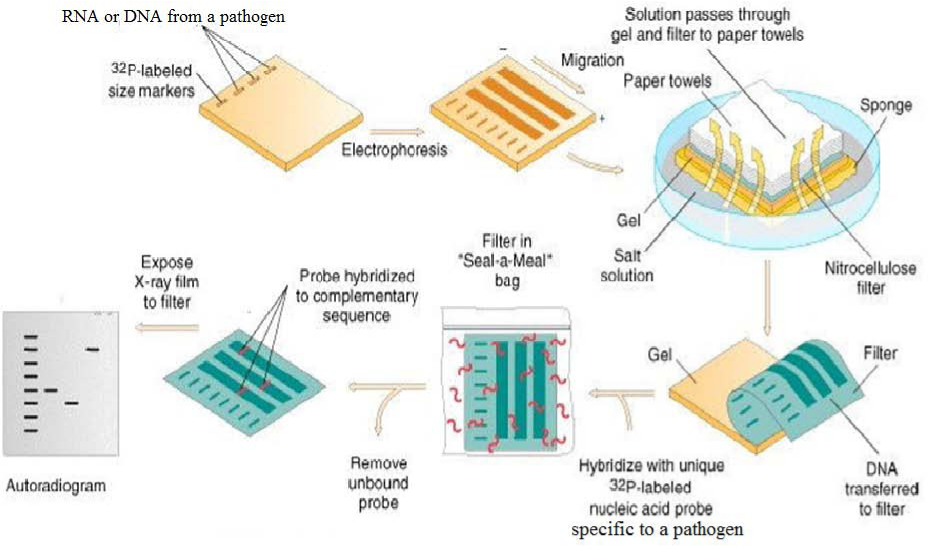 Nucleic Acid hybridization technologies are based on simple structure of DNA which is composed of four repeating nucleotides, adenine, guanine, cytosine and thymine. DNA is coiled to form a double helix strand and composed of two strands held together by hydrogen bonds these bonds are pH and heat labile. DNA fragments from different sources with similar sequences anneal together to form double stranded DNA and this process is called hybridization as shown in Figure 1A & 1B. For detection and diagnostic purposes, particular sequences of DNA of interest can be detected with help of a probe which is a short sequence of nucleotide bases that binds to specific regions of a target sequence of nucleotides. For detection purposes the probes can be labeled either with radiolabel isotopes, or fluorescent tags so they can be detected after the hybridization to a particular target sequence of interest. DNA or RNA fragments of interested can be detected with hybridization approaches called Southern or Northern blots respectively as illustrated in Figure 1B. In past 15years, this area has been heavily commercialized and therefore a variety commercial probes for different detection targets of interest and hybridization solutions kits exists for quick application with ease. These tools, which were once used solely in the domains of researchers and anatomic pathologists, have been demonstrated to be useful for the detection of pathogens in blood culture samples as well as in other clinical specimens.7‒11