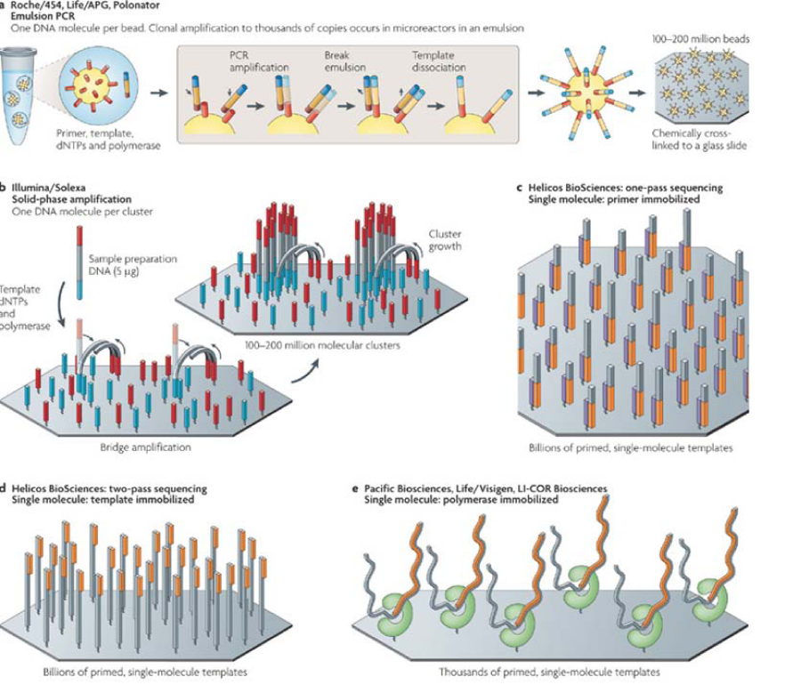 As described by Sanger et al.,18 the dideoxynucleotide termination sequencing of DNA has undergone rapid revolution with large scale production style next generation sequencing (NGS) technologies. The next generation sequencing technologies generate its templates either by clonally amplified templates originally from single DNA molecule and single DNA molecule templates. These NGS technologies are described as these methods are classified as cyclic reversible termination (CRT), single-nucleotide addition (SNA) and real-time sequencing. Sequencing by ligation (SBL), an approach in which DNA polymerase is replaced by DNA ligase, is also described. Imaging methods coupled with these sequencing strategies range from measuring bioluminescent signals to four-color imaging of single molecular events.