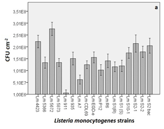 Seventeen different L. monocytogenes strains were tested using a modified crystal violet assay for their quantification. The evaluation of their biofilm-forming ability was carried out after a 48-hour incubation period at 30ºC. The media employed was the one proposed by Pan et al.,31 which was TSYEB with a supplement of glucose and sodium chloride.
