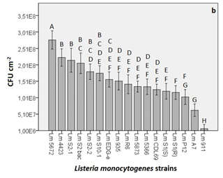 When the Tukey’s B test was applied, 8 different groups (codified from A to H) with significant differences (p<0.05) between them were found (Figure 2B). In those groups, there were strains that belonged to a single group (e.g. Lm 5672, 4423, S2-1, S1(R), A7 and 911) and others that could be classified into more than just one group. For example, strain Lm 5672 fits into group A only, whilst strain Lm S2bac fit into groups B and C.