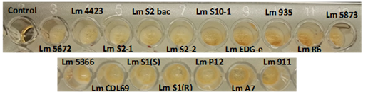 Biofilm formation detection of the different strains on polystyrene surfaces was also assayed using the product Biofinder. The results (Figure 3) showed not only a strong positive reaction with plentiful bubble formation in the different wells, but they also demonstrated that the intensity of the bubbles was higher in the strains that were found to be more biofilm-producing than the ones that were less biofilm-producing. The present study demonstrated prolific bubble formation, which was considered to be an intense and positive reaction. Moreover, the use of this product also allowed us to screen the bacterial strains from the strongest biofilm producer to the weakest. The results concurred with those obtained when quantifying the biofilms formed with the different strains of L. monocytogenes, whereas this product can also be used as a screening tool to identify which strains are stronger and weaker biofilm producers.