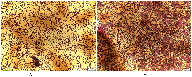 A qualitative study was conducted to observe not only the typical morphology of the biofilms, but also to show how they increase over the time (Figure 4). The percentage of covered areas at 48 hours of incubation was lower than the percentage after one week of incubation. Figure 4B shows compact biofilm agglomerations with high cell density, as opposed to Figure 4A, which presents a more distributed network of microcolonies all over the polystyrene surface. This is important for visually determining the optimal biofilm network and for further protocols to develop more agglomerated biofilms. For further research, biofilms should be developed under an incubation period of one week due to they showed more compact agglomeration and a higher cell density, which can helps us to better understand biofilm behaviour in its mature stage.
