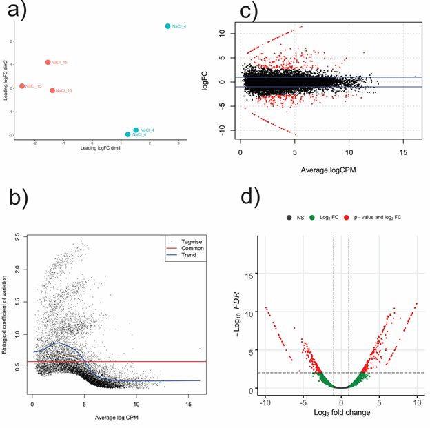 Early-stage differential expression analysis removed 1,400 transcripts with low expression through all replicates (CPM < 0.9). A comparison of replicates consistency evaluated with multidimensional scaling showed that each NaCl treatment clustered separately (Figure 1a). The standard dispersion value, an indicator of the biological coefficient of variation (BCV), was 0.34. Mathematically, the BCV is equal to the square root of typical dispersion and had a value of 0.58 (Figure 1b). Statistical comparison between 15% NaCl against 4% NaCl generated 420 DET with FDR < 0.01 and two-fold change (FC > |2|) parameters. Regarding 15% NaCl treatment, two hundred and twenty-seven transcripts were up-regulated, while hundred and ninety-three transcripts were down-regulated. DET distribution between NaCl treatments was represented on mean average (MA) and Volcano plots (Figure 1 c-d). The heatmap, constructed with DET, displayed the aggrupation of replicates within its corresponding cluster and confirmed different expression patterns between each NaCl treatment (Figure 2).