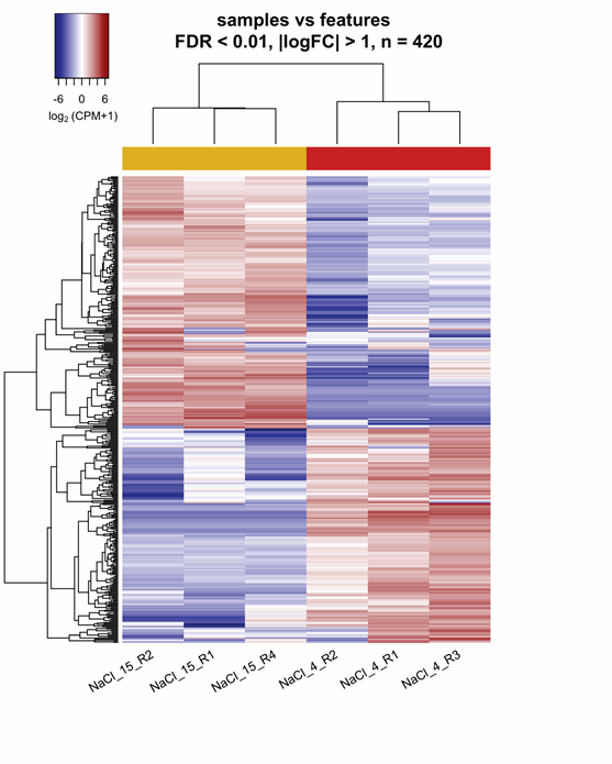 Figure 2 Clustering of the up and down-regulated transcripts from 15% NaCl vs 4% NaCl comparison in Aspergillus loretoensis. FDR, false discovery rate; FC, fold change; CPM, counts per million; Red: Up-regulated, Blue: Down-regulated, R, replicate.