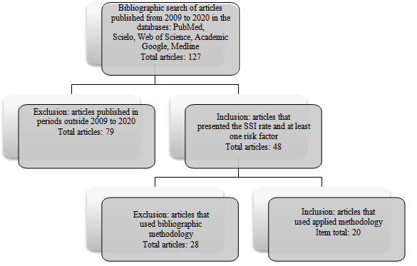 The present work was a critical literature review of scientific articles published from 2009 to 2020, emphasizing on the etiology and risk factors in accordance with SSIs, and relevant data validating the content were tabulated and discussed at the end. Scientific articles were selected through digital searches, using the following descriptors: surgical site infections and hospital infection. Articles published indexed in Pubmed, Scielo, Web of science, Medline, Google academic databases were selected, seeking to explain the problem from the theoretical references.As a way to guide the work, the following problem question was elaborated: “What are the epidemiological aspects and risk factors related to the development of SSI?” To guide the selection of articles, inclusion criteria (articles that presented the SSI rate and risk factors) and exclusion criteria (articles published outside of 2009 to 2020) were used (Figure 1).