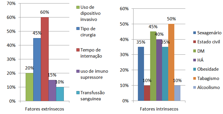 The analysis of intrinsic and extrinsic risk factors indicated that the presence of smoking and comorbidities, and the patient's advanced age are one of the main intrinsic factors associated with the development of ICS and the length of stay, type of surgery and the use of an invasive procedure such as CVC and implants are important extrinsic factors. It is concluded that the association between risk factors related to the development of ICS increases the probability of aggravation of the infection picture.
