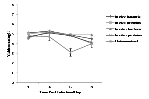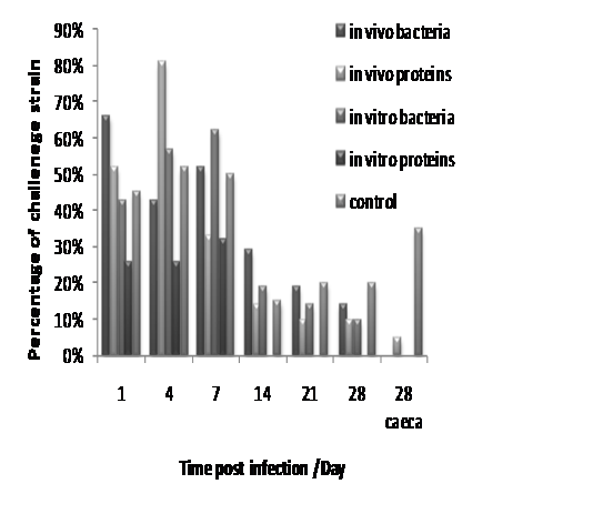 At 4th week post infection no Salmonellae were detected from caecal swabs from the vaccinated groups (<1 x 102cfu/ml) compared with unimmunised group that show the percentage of Salmonellae positive to be 35%.However, these results showed that the better protection induced by the proteins from the in vitro cultured bacteria in comparison with the proteins from the in vivo harvest bacteria were unexpected, since it was anticipated that the in vivo preparation would have been at least as immunogenic as the in vitro preparation, as the protein concentrations of both in vivo and in vitro preparation were similar. However, the reason that the effectiveness of the in vivo preparation as vaccine was less than that of the in vitro preparation may have been the result of degradation of the proteins harvested from chicken caeca by avian proteases as discussed earlier (Chapter 4). The in vivo preparation would have contained a number of antigens that are expressed in the very earliest stages of infection and these may have been important. Moreover, certain genes that encode some important antigens such as LPS and flagella were down-regulated in the intestine of chickens.17,32