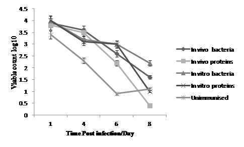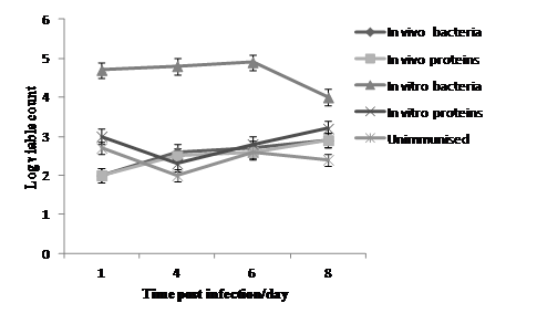 However, 1 day post infection birds vaccinated with in vitro formalin killed showed the highest bacterial count (Log10 4.7cfu/ml) of lactose fermentors in their caecal contents with P value (P<0.04), followed by the group immunised with in vitro proteins which produced counts of Log 3.0 cfu/ml with P value (P <0.6). On 4th day post-infection the birds immunised with in vitro bacteria again showed the highest count (Log 4.8 cfu/ml) followed by the groups immunised with in vivo bacteria and in vivo proteins which had mean counts of Log 2.6 cfu/ml and 2.5cfu/ml respectively as illustrated in Table 5 and Figure 4. Caecal contents that showed no bacterial growth were considered as (<Log 2cfu/ml) which means that the average of bacterial count is less than the limit of detection.