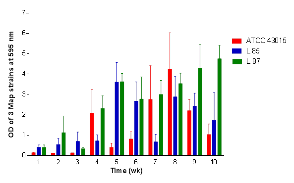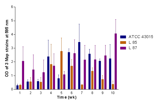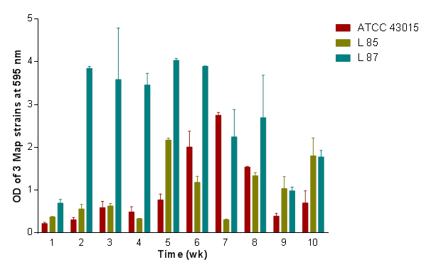 An ANOVA showed a general significant difference (P < 0.05; 0.0004) in biofilm density amongst the 3 Map strains. The L 87 strain grew more cell mass compared to L 85 and ATCC 43015 strains. Thus, L 87 had a better response to growth in DW than the other two strains in the first 8 weeks of incubation before dropping in cell density in the following weeks (9 and 10). The L 85 and ATCC 43015 pattern however, followed an irregular trend with a generally low cell density between week 1 to 8 compared with L 87 (Figure 3).