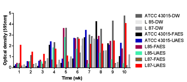 In Figure 6, the impact of DW, FAES and UAES on biofilm development of the 3 isolates were compared. The distilled water supported biofilm formation by the 3 isolates but was lower than FAES and UAES. The L 87 developed more biofilm over the 10-week period in both FAES and UAES than was the case for L 85 and the ATCC 43015. Weeks 1 to 3 seemed to have lagged in biofilm development with maximum optical density attained by L 87 whilst weeks 5 to 7 recorded denser biofilm for all the 3 isolates. The Crohn’s isolate (ATCC 43015) was comparable in density of growth to L 85 in FAES whilst L 85 recorded the least density at weeks 9 and 10. Thus, in general, the performance of the isolates in both media over the 10-week period was highest by L 87, and L 85 being slightly higher than ATCC 43015.