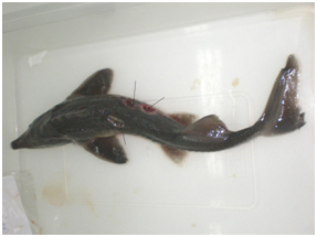 On a sturgeon farm with recirculation aquaculture systems in North Bulgaria, an average daily mortality of 30 fish has occurred in September 2015 among fish weighing 200-800 g. In this study, a total of 10 fish were used (5 Siberian and 5 hybrid sturgeons).