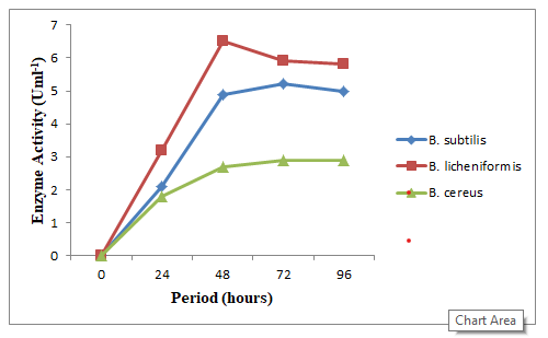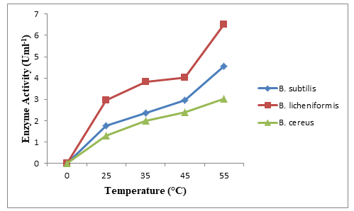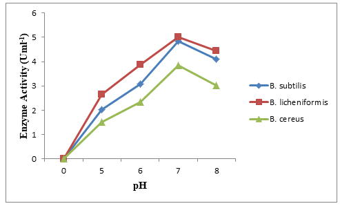 The enzyme activity for different pH of the production medium was presented in Figure 3. Based on the pH values, the bacterial species produces enzyme activity ranged from 2.04-4.85, 2.65-5.02 and 1.51-3.85 for B. subtilis, B. licheniformis and B. cereus respectively. The bacterial species are alkalophilic as they present better enzyme activity between pH 7 and 9.31 The optimal enzyme activity across all the bacterial species was at pH 7. A gradual reverse trend of the enzyme activity was observed at pH 8 (figure 3). The trends may because, the cells may not perform at basic nature of the medium; they may remain at rest. At pH eight alkalophilic flagellated Bacillus species becomes less active.31 This agrees with the report30 that there was decreased trend of 5.00-2.14 Uml-1 enzyme activity at pH 5 to11 and the optimum enzyme activity was pH 7. Similar results were reported.15,23,34