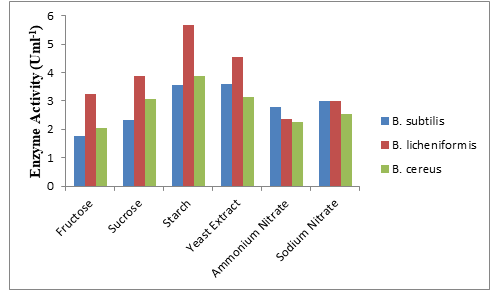 The results of biosynthesis of enzyme amylase on sugars (Figure 4) showed that starch was the best carbon source across all the isolate 3.55-5.67Uml-1 followed by 2.33-3.87Uml-1 sucrose and 1.78-3.25Uml-1 fructose the lowest. On nitrogen sources, the enzyme activity range indicated yeast extract 3.13-4.55Uml-1 as the best, followed by NaNO3 2.55-3.01Uml-1 and NH4NO2 2.25-2.79Uml-1 the lowest. Thus, each of the three (3) Bacillus species could produce greater enzyme at starch and yeast extract nutrients.