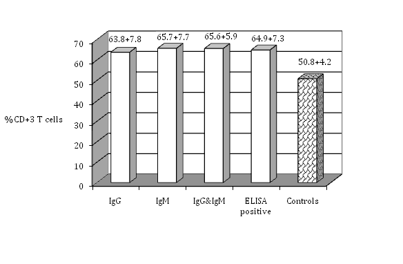 Figure 1 The percentage of CD+3 T cells in the peripheral blood lymphocytes of seropositive women for toxoplasmosis compared with the healthy controls (no antibodies).
