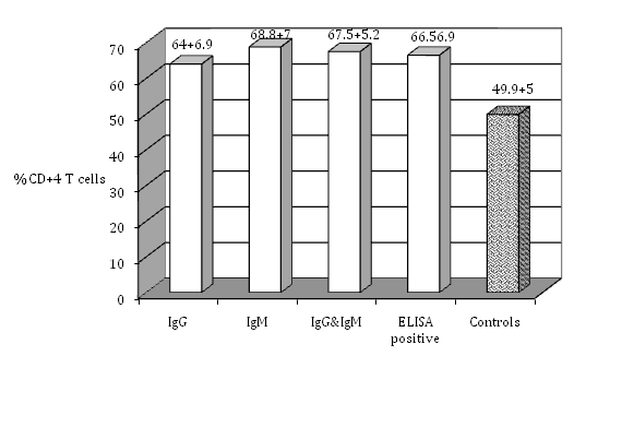 Figure 2 The percentage of CD+4 T cells in the peripheral blood lymphocytes of seropositive women for toxoplasmosis compared with the healthy controls (no antibodies).