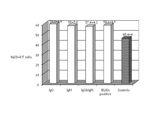 Figure 3 The percentage of CD+8 T cells in the peripheral blood lymphocytes of seropositive women for toxoplasmosis compared with the healthy controls (no antibodies).