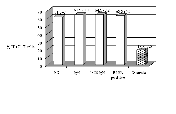 Figure 4 The percentage of CD+71 T cells in the peripheral blood lymphocytes of seropositive women for toxoplasmosis compared with the healthy controls (no antibodies).