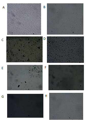 Figure 1 Entophytic actinobacteria strains A (CP56L), B (CP56S), C (CP84BL), D (CP84BS), E (CP200BS), F (CP200BL), G (CP21A2S), and H (CP21A2L) observed under 40X magnification with light microscope. S = solid; L = liquid.