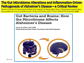 One important scientific discoveries in recent years have been the discovery that the intestinal microflora takes part in two-way communication between the intestines and the brain.29 Scientists show that human intestinal microflora may even act as a the second brain should be responsible for neurodegenerative disorders such as Alzheimer's disease (AD). Despite the human-related Bacteria communities are generally stable, they can be modified by everyday human actions and experiences. Antibacterial bacteria, Complement, pathogenic microorganisms, may have a significant impact on the immune system, brain development, and behavior, such as They are capable of producing several neurotransmitters and neuro-modulators like serotonin, kynurenine, catecholamine, etc., as well as Amyloids. However, brain destruction mechanisms, which can lead to AD dementia, start with the intestinal microbiome dysbiosis, development of local and systemic inflammation, and dysregulation of the intestinal brain axis. Increased permeability of the colon epithelial barrier results neuro-inflammatory reactions in the brain. It seems that, the infectious hypothesis of AD, with a considerable role of Gut microbial, begins to gently push into the hypothetical shadow of the amyloid cascade that has dominated for decades. It strongly assumes that AD can start in the intestines, and is closely related to the imbalance of microbiota in the intestines. This is a promising area for therapeutic intervention. Modulation of microbiota in the intestines using a personalized diet or microbiota intervention is beneficial, change Microbial partners and their products, including amyloid protein, will probably become a new treatment for AD (Figures 2 & 3).