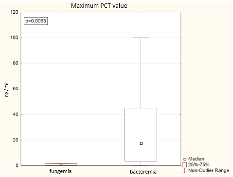 Analysis of these maximum PCT values during an infectious episode differed significantly in infections caused by fungal and bacterial pathogens. The median maximum PCT values for fungal infections was 0.38 ng/ml (0.27-1.53), with bacterial infections-17.46 ng/ml (3.59-45.01), p=0.0063. With fungal infections of the bloodstream (n=7), the maximum PCT level during the infectious episode was significantly lower than with bacterial infections of the bloodstream (n=10), Figure 1.