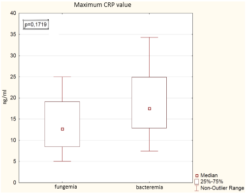 When comparing the maximum CRP values for an infectious episode in children, there was no significant difference in levels in infections caused by fungal or bacterial pathogens. The median of the maximum CRP values for fungal infections is 12.68 mg/dL (8.5-19.12), for bacterial-17.53 mg/dL (12.89-24.9), p=0.1719, Figure 2.
