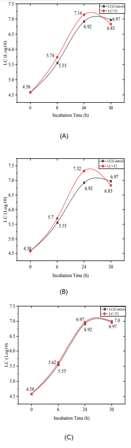 The growth pattern of Lactobacillus casei as control (LC) and with the concentrations of 100, 200, 300ppm of dye as test (denoted as LC+T1, LC+T2 and LC+T3 respectively) is as shown in Figure 1: A-C. The log10 concentration of L. casei when exposed to tartrazine at concentrations T1, T2, T3, exhibited marginal though, increased growth compared to control at 6h, which then decreased with time. Log10 concentrations of control (LC), test 1(LC+T1), test 2 (LC+T2) and test was 5.55, 5.74.5.7 and 5.62 at 6h respectively (Figure 1A-C). There was no significant difference observed in the growth pattern of L.casei in test with different concentration of tartrazine (T1, T2, T3) at 24h and 30h as compared to control (LC).