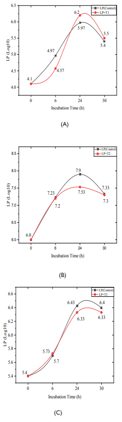 (LC, Lactobacillus casei; LP, Lactobacillus plantarum; BB, Bifidobacterium bifidum; T1: 100ppm tartrazine T2: 200ppm tartrazine T3: 300ppm tartrazine)