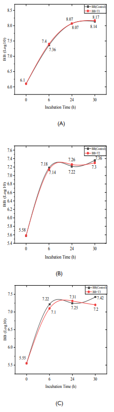 The growth pattern of Bifidobacterium bifidum with T1, T2 and T3 is shown in Figure 3A-C. The cell concentration (Log10) of B. bifidum was 6.1 at 0h with T1. The log10 concentrations of control (BB) and test-1 (BB+T1) were the same, i.e.,7.4, 8.07, and 8.17 at 6, 24 and 30h respectively (Figure 2A). With test-2 (BB & BB+T2) the initial cell concentration was 6.0 (0 hours). The cell concentrations of the test-2 (BB+T2) were 7.17, 7.26, 7.3 and 7.08 at 6, 24 and 30 hours as against the cell concentrations 7.18, 7.22 and 7.36 of the control (BB) at 6, 24 and 30 hours respectively (Figure 2B). Cell concentration of test-3 (BB+T3) was estimated to be 5.55 (0h), 7.1, 7.31 and 7.2 as against 5.56, 7.24 and 7.31, 7.42 of the control (BB) at 6, 24 and 30 hours respectively (Figure 2C). B. bifidum when exposed to 100ppm showed no change in growth pattern. However, there was marginal decline in growth with 200ppm and 300ppm TZ.