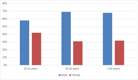 Over a period of 2 years, 952 samples obtained from the Urology department were sent to the Microbiology Laboratory for cytobacteriological study. Among these samples, 176 cases were having the criteria for UTI with a prevalence rate at 18.5%. The mean age was 56 years with extremes ranging from 19 to 93 years. The most affected age range group was the group of patients older than 60 years. The male gender was predominant with a sex-ratio (M/F) at 2 (Figure 1).