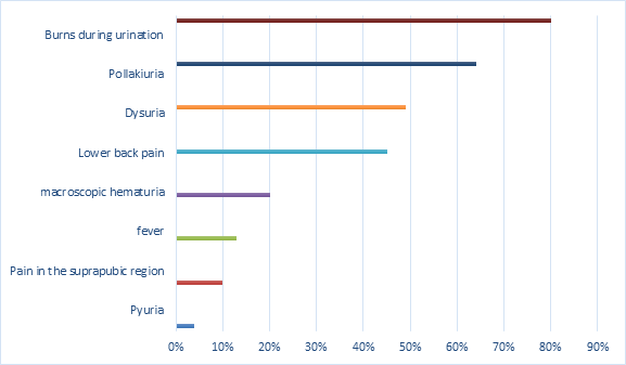 Clinical urinary signs were dominated by burns during urination (80%), followed by pollakiuria (64%), dysuria (49%), lower back pain (45%), macroscopic hematuria (20%), fever (13%), pain in the suprapubic region (10%) and pyuria (4%) (Figure 2).
