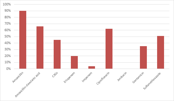 Enterobacteriaceae Strains were resistant to amoxicillin in 90%, to amoxicillin-clavulanic acid in 66%, and to third-generation cephalosporins in 45%. Twenty-four percent of isolates had decreased susceptibility to carbapenems, with resistance to ertapenem in 20% and to imipenem in 4% of the isolates (Figure 4).