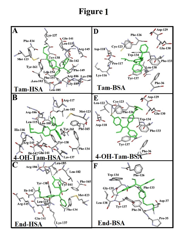 Docking results for tamoxifen and its metabolites conjugated with HSA and BSA are presented in Figure 1 and Table 1. In drug-HSA conjugates, tamoxifen is surrounded by Arg-145, Arg-186, Glu-141, Gly-189, Ile-142, Leu-115, Leu-154, Leu-182, Leu-185, Lys-137, Lys-190, Met-123, Phe-134, Phe-149, Phe-157, Tyr-138 and within the hydrogen bonding distance of *Tyr-161 (Figure 1A). 4-Hydroxytamoxifen is located next to Arg-117, Arg-145, Arg-186, Glu-141, His-146, Ile-142, Leu-115, Leu-182, Leu-185, Lys-137, Met-123, Phe-134, Phe-165, Tyr-138 and Tyr-161 and H-bonding to *Leu-186 (Figure 1B & Table 1). Endoxifen is located in the vicinity of Arg-145, Arg-186, Glu-141, Ile-142, Leu-115, Leu-182, Leu-185, Lys-137, Met-123, Phe-134, Phe-165, Tyr-138 and Tyr-161 with H-bonding distance of *Leu-182, *Leu-185 and *Ile-142 residues (Figure 1C & Table 1) The free binding energy (ΔG) shows the stability of the complexes formed: 4-hydroxytamoxifen> endoxifen>tamoxifen (Table 1). In the drug-BSA adducts, tamoxifen is surrounded by Asp-118, Asp-129, Cys-123, Glu-130, Leu-138, Lys-116, Phe-36, Phe-126, Phe-133, Pro-117, Trp-134 and Tyr-137 (Figure1D & Table 1). 4-Hydroxytamoxifen is located next to Asp-118, Asp-129, Cys-123, Glu-130, Leu-122, Phe-36, Phe-126, Phe-133, Trp-134 and Tyr-137 with hydrogen bonding network with residue *Cys-122 and *Leu-122 (Figure 1E) Finally, endoxifen is in the vicinity of Asp-37, Gly-135, Leu-138, Phe-36, Phe-126, Phe-133, Pro-35, Trp-134, Tyr-137 with h-bonding distance of the *Asp-37, *Leu-138 and *Trp-134 residues (Figure 1F & Table 1).