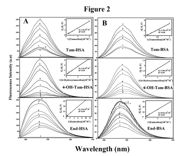Figure 2 Fluorescence emission spectra of protein (25 µM) in Tris-HCl (pH 7.4) in the presence of tamoxifen, 4-hydroxytamoxifen and endoxifen, with A) tamoxifen– HSA: (a) free HSA (25 μM), (b-h) with tamoxifen at 5, 10, 20, 30, 50, 60 and 80 µM; 4-hydroxytamoxifen–HSA: (a) free HSA (25 µM), (b-h) with 4-hydroxytamoxifen at 5, 10, 20, 30, 50, 60 and 80 µM and endoxifen-HSA: (a): free HSA (25 µM); (b-i) with endoxifen at 1, 5, 20, 30, 40, 60, 80 and 100 µM. For B) tamoxifen-BSA: (a) free BSA (25 μM), (b-f) with tamoxifen at 10, 20, 60, 80 and 100 mM ; 4-hydroxytamoxifen–BSA : (a) free BSA (25 mM), (b-h) with 4-hydroxytamoxifen at 5, 10, 20, 40, 60, 80 and 100 mM and endoxifen-BSA: (a): free BSA (25 mM); (b-j) with endoxifen at 2, 5, 10, 20, 30, 40, 60, 80 and 100 mM. The plot of 1/(A-A0) as a function of 1/drug concentration. The binding constant K being the ratio of the intercept for drug-HSA (A) and drug-BSA (B).