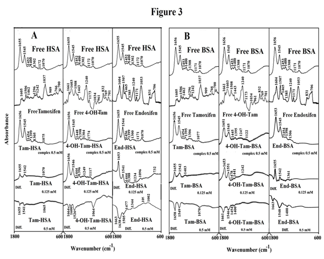 The conjugation of tamoxifen and its metabolites with BSA and HSA was characterized by infrared spectroscopy and its derivative methods. Drug-protein interactions alter protein conformation and induce spectral change for protein amide I band at 1659-1657 cm-1 (mainly C=O stretch) and amide II band at 1546-1545 cm−1(C-N stretching coupled with N-H bending modes) .34 The intensity variations of protein amide I and amide II bands obtained by difference spectra [(protein solution + drug solution) - (protein solution)] are shown in Figure 3.