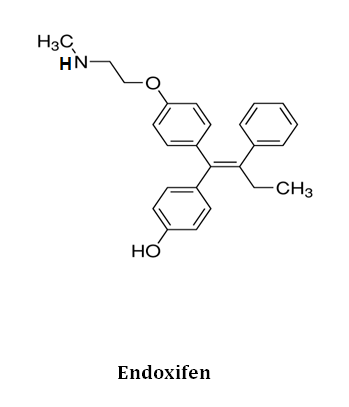 Tamoxifen is an antitumor drug that has been in worldwide use for the treatment of estrogen receptor (ER)-positive breast cancer for over 30 years and has been used in both the metastatic and adjuvant settings. Tamoxifen suffers from low solubility and low selectivity, and thus the long-term usage of drug exposes patients at increased risk of having uterine malignancies .15,16 In the clinical development of tamoxifen, it became clear that tamoxifen underwent metabolism to 4-hydroxytamoxifen and endoxifen (Scheme 1), and these metabolites exerted tamoxifen’s drug action. Tamoxifen exerts its action as a breast cancer drug/chemoprevention agent by antagonizing the action of estradiol, by its binding to the ligand binding domain of ERα and provoking a conformational state of the protein that is incapable of binding to the estrogen receptor. In addition to its anti-estrogenic action, tamoxifen and its metabolites form adducts with DNA and hepatic toxicity is found in animal models .17 Loading of tamoxifen and its metabolites with serum proteins increases the solubility of the drug and improves its tissue-specific targeting as well as provides a tool for the sustained release of the drug .17-20
