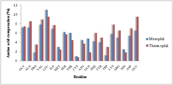 Environmental temperature plays an important role in the cell life.1 There are four classes of organism in relation to their optimal growth temperature namely hyperthermophile (>80◦C), thermophile (45-80◦C), mesophile (20-45◦C) and psychrophile (<20 ◦C).2 Thermal stability is defined as the ability of material to resist changes in physical structure or chemical irreversibility, or spatial structure stability of polypeptide chains at high temperatures.3 Studies showed that thermal stability of thermophilic proteins is related to a series of protein sequential and structural properties.4 A small number of these mentioned properties are going to be introduced in this paper. Also, the amino acid compositions difference had been studied in mesophilic and thermophilic proteins.3,5-7 For instance, Zhang and Gromiha research shows that Lys, Arg, Glu and Pro were higher and Ser, Met, Asp and Thr were lower in number of thermophilic than the of mesophilic proteins number .6,8 (Figure 1). Protein secondary structure stability like alpha-helix is considered as a necessary factor for thermal stability.6 Studies suggested that thermal-stability is increased by certain characteristics in proteins. These characteristics are: increased number of hydrogen bonds.7 salt bridges, ion pairs .9 aromatic clusters.8 sidechain-sidechain interactions, electrostatic interactions of charged residues .9 and hydrophobic interactions.5