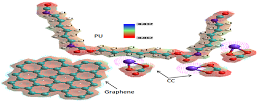 Figure 2 demonstrates the MESP of absorption process of CC in graphene/PU composite and their electrostatic interactions, showing the negative (red) regions were related to electrophilic reactivity and the positive (blue) regions to nucleophilic reactivity. The absorption of CC by the graphene/PU has mainly involved the formation of hydrogen bonds between PU and graphene and CC with PU respectively. The negative log P values for the graphene/PU indicated that absorption properties of the composite are dominated by its hydrophilic character and that absorption plays an important role in the CC absorption partitioning and receptor–binding. It was also shown that graphene changes the hydrophobicity of PU. The MESP values from 0.0837 at 0.067 eV indicated that the nucleophilic and electrophilic regions mainly involved the C=O, C–O of the PU and CC, respectively so graphene molecule, respectively.